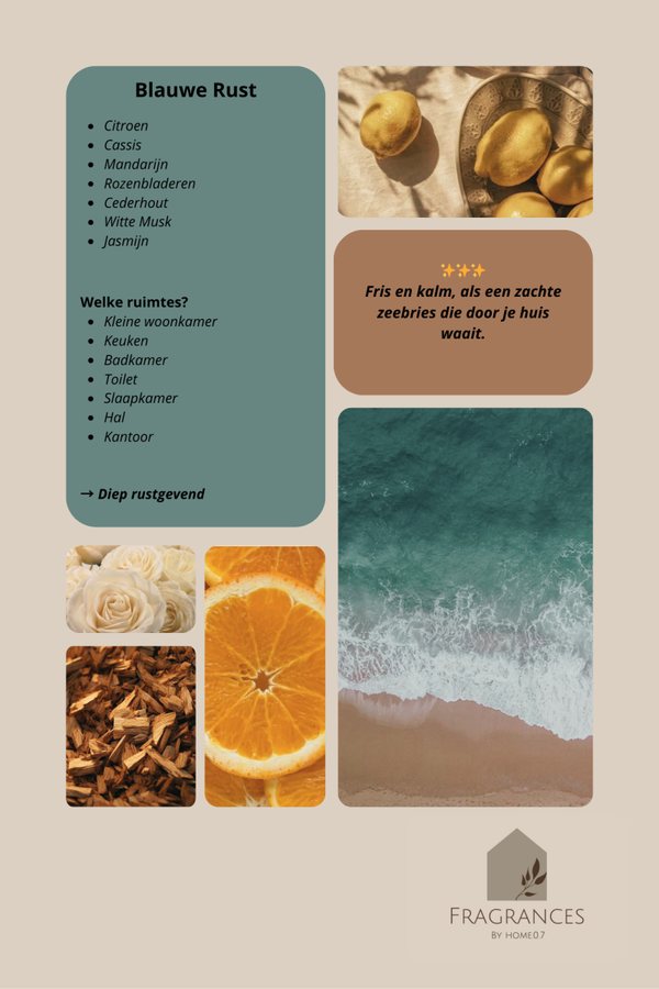 Fris als een zeebries: helder, schoon en kalmerend. Lichte citrus en zachte musk vloeien samen tot een geur die voelt als een rustige dag aan zee, waar alles even stil en licht wordt.