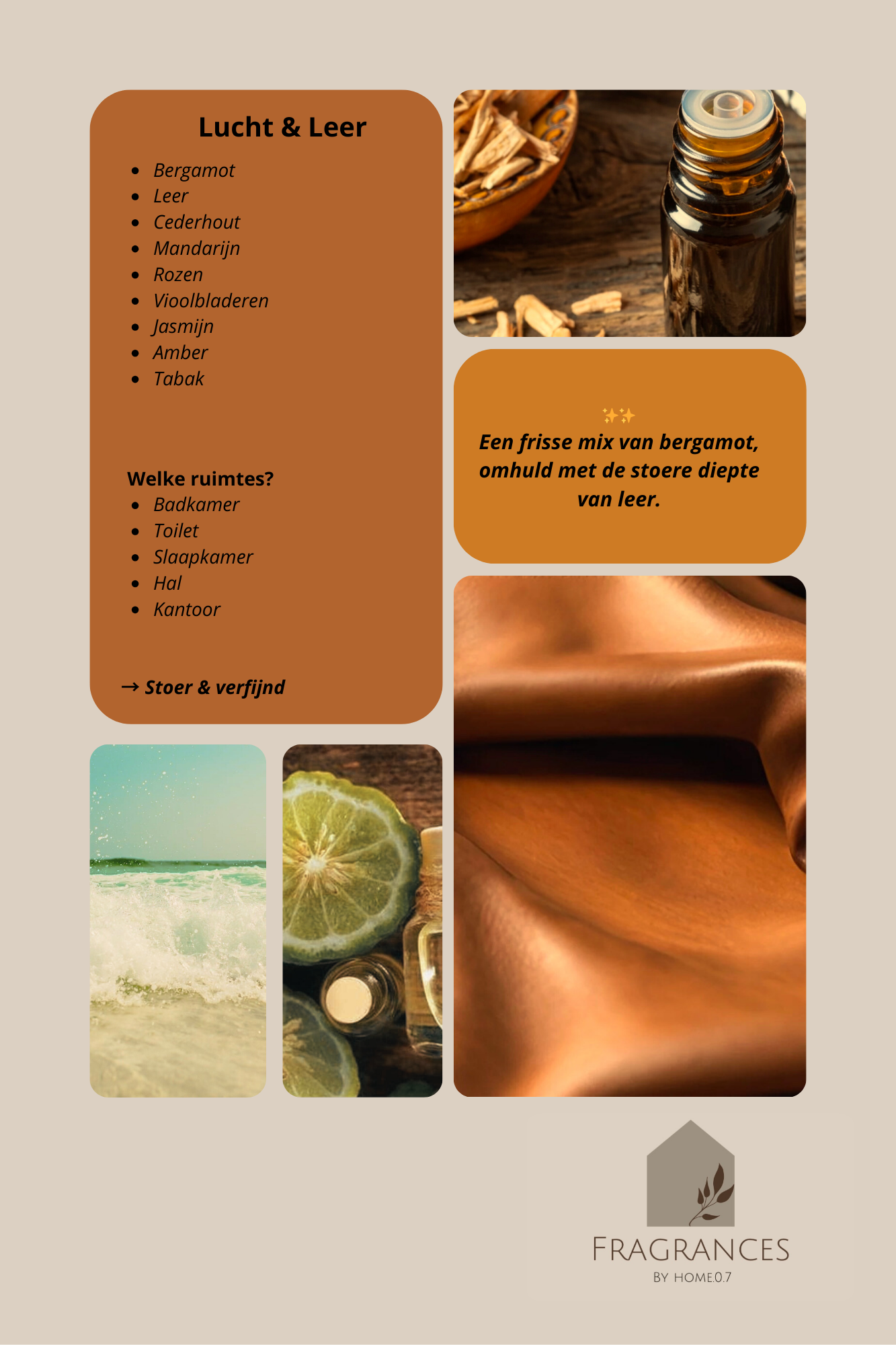 Fris en stoer tegelijk. Heldere citrus en luchtige noten openen licht, waarna soepel leer en warme houttonen de geur een krachtige, elegante diepte geven die blijft hangen.