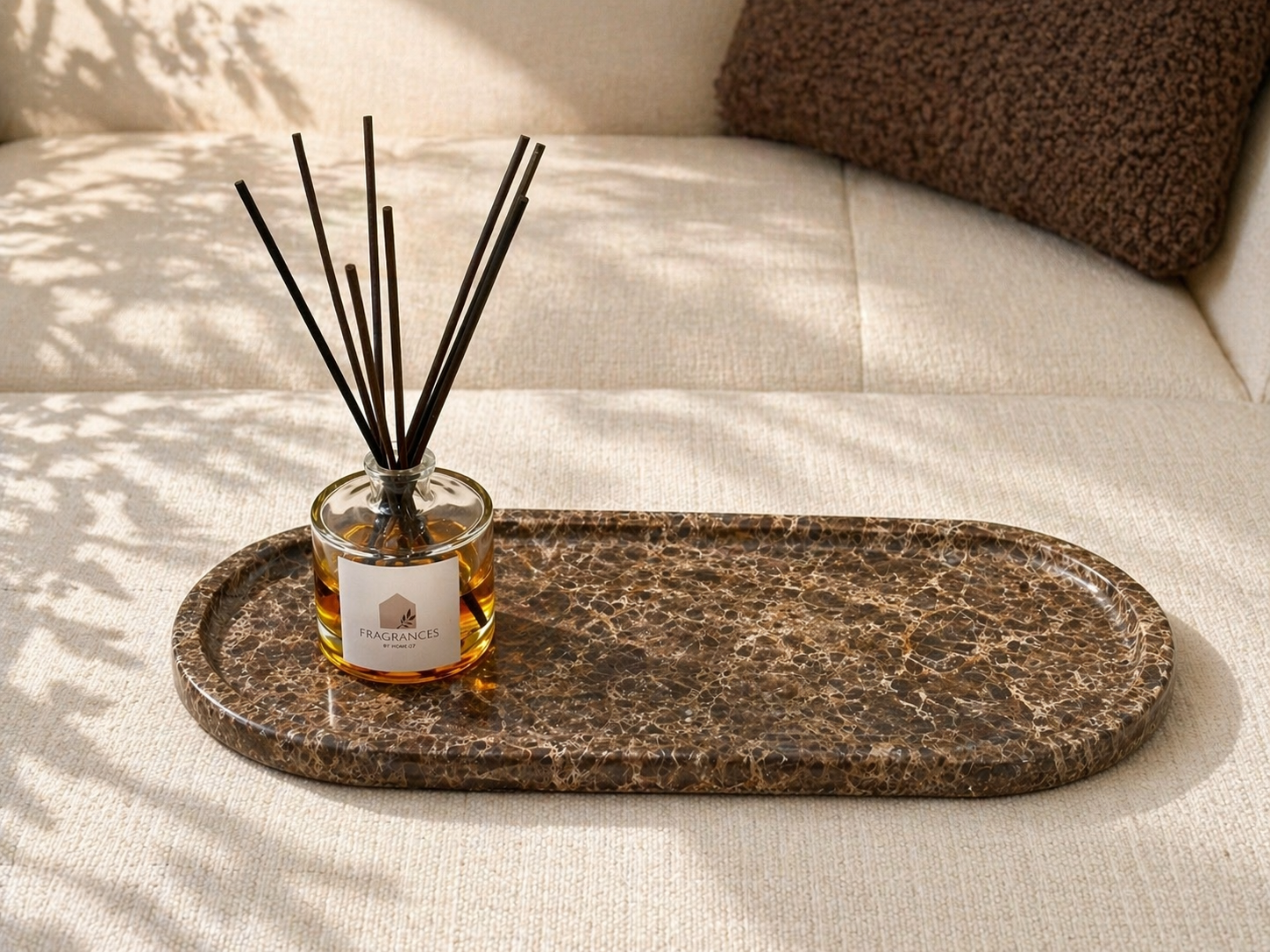 Deze marmeren tray in een ovale vorm en een formaat van 30x15cm is een stijlvolle toevoeging aan elk interieur. De tray is gemaakt van bruin marmer, waardoor elk exemplaar uniek is dankzij de natuurlijke kleur- en patroonvariaties. Gemaakt van echt marmer voor een luxe uitstraling. Met een afmeting van 30x15cm past deze tray in verschillende ruimtes, van de woonkamer tot de badkamer. Marmer is een duurzaam materiaal dat lang meegaat. Dit bruin marmeren dienblad combineert functionaliteit met een stijlvol design, perfect om je huis mee aan te kleden of als geschenk.